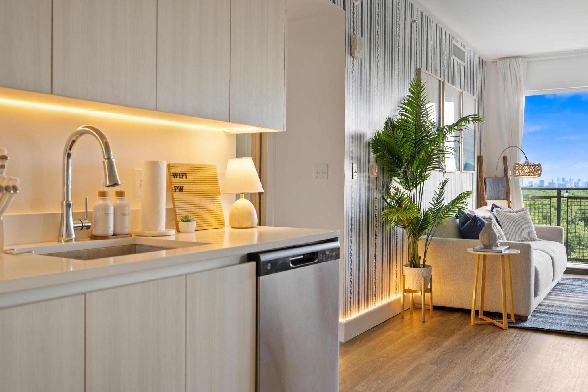 Enjoy a bright, stylish condo with an open-concept living area, fully equipped kitchen, in-unit laundry, and a spacious balcony overlooking the pool. Guests have full access to all rooms, both bathrooms, the kitchen, the living space, and building amenities including the gym, co-working lounge, and common areas.