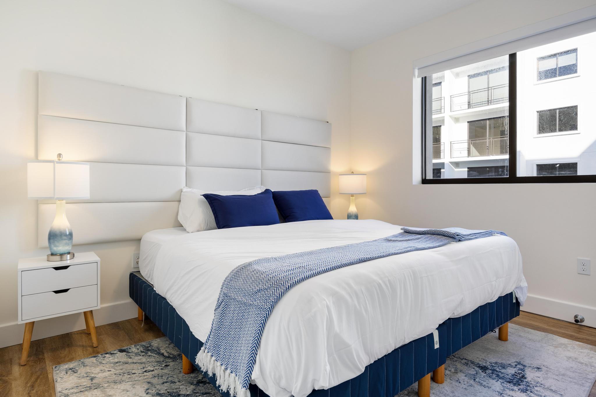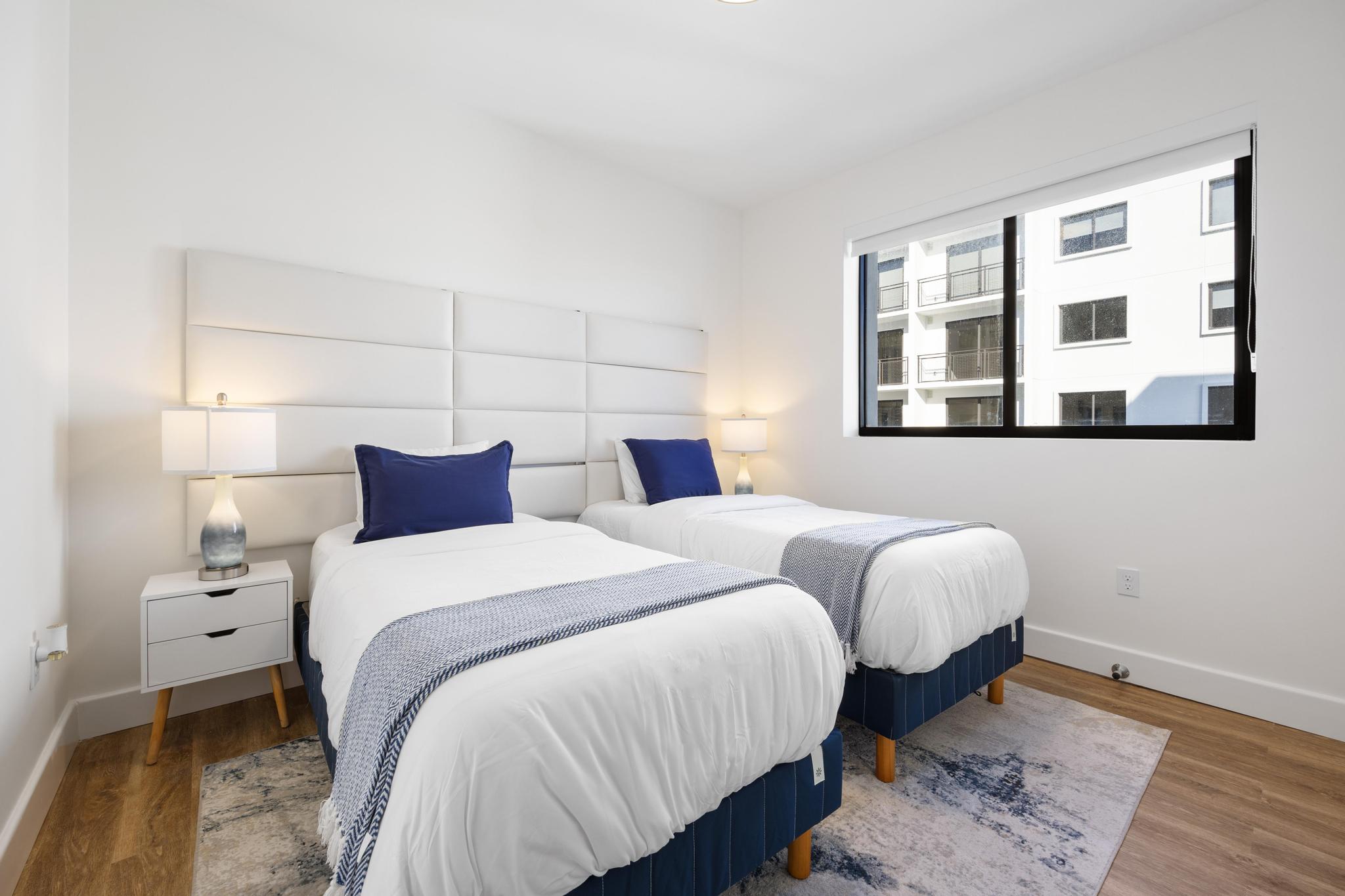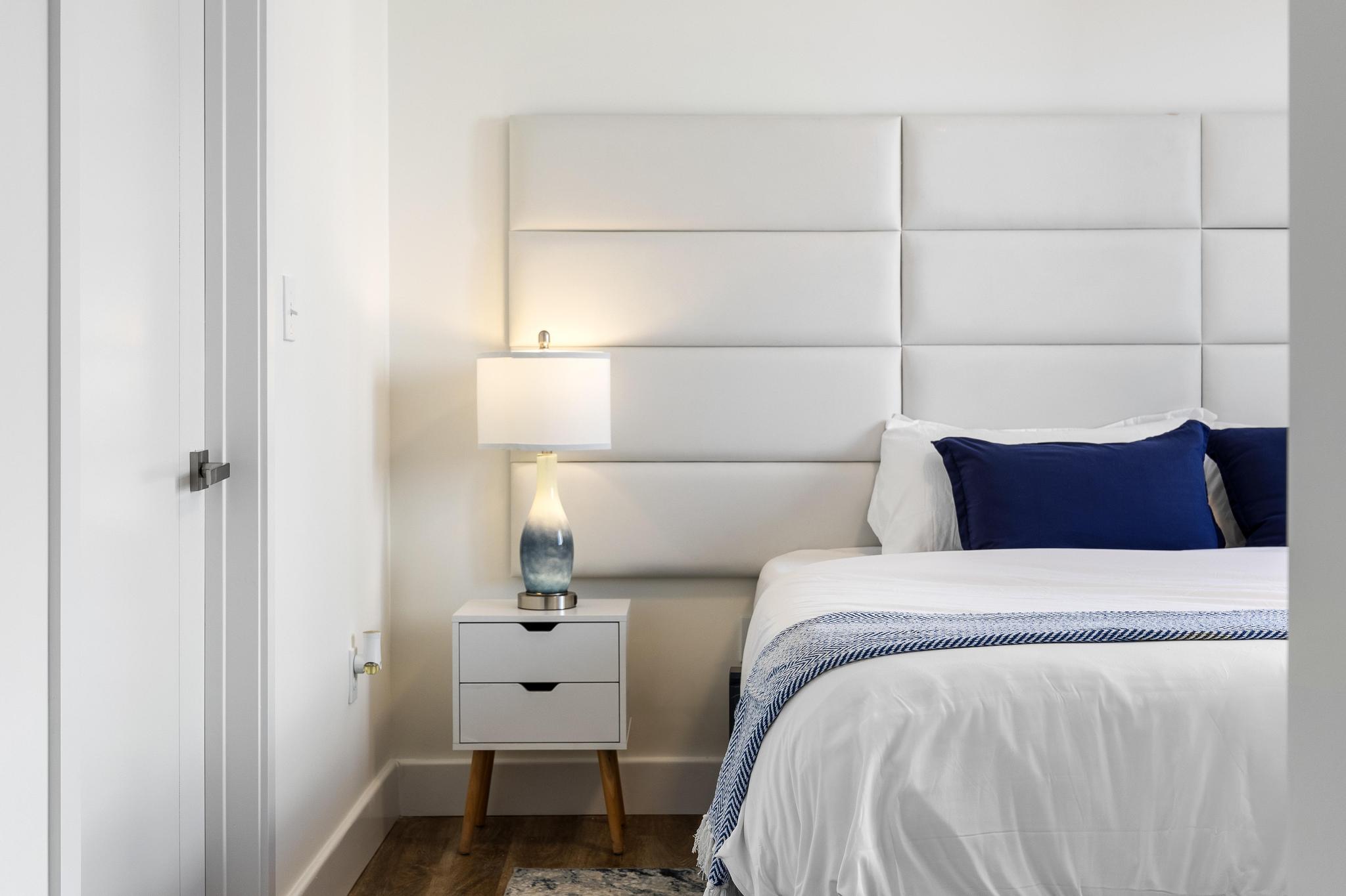 This modern 2-bedroom condo offers a comfortable master suite with a plush bed, ensuite bathroom, and balcony access. The second bedroom includes twin beds that can convert into a king for flexible sleeping arrangements. Both rooms are designed with calming coastal decor, ideal for families, friends, or business travelers.